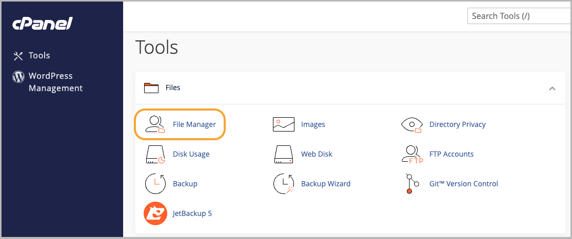 - In cPanel's Tools screen, looks under Files and click File Manager to access the website files stored on your hosting server.