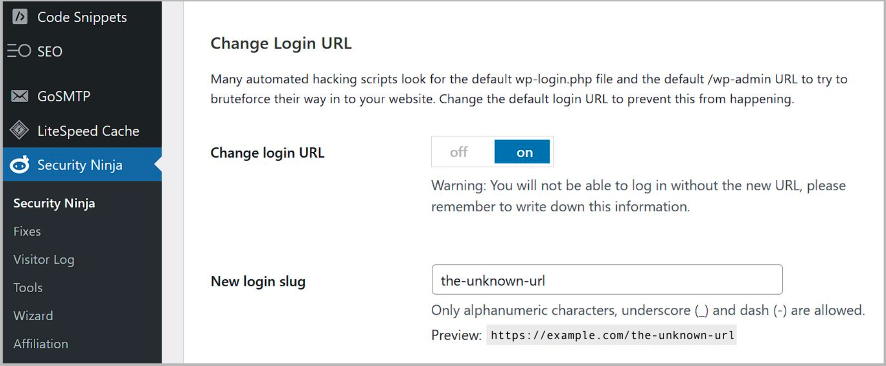 .htaccessfile. This method gives you more control but requires a tad more care. If you can handle code as carefully as your mum's best china, this is for you. - Security through pro plugins (The full package)—If you're after the full monty, security plugins like WP Security Ninja not only let you change your login URL but also throw in a bunch of other sweet security features. They're like having a security guard, CCTV, and alarm system all rolled into one.