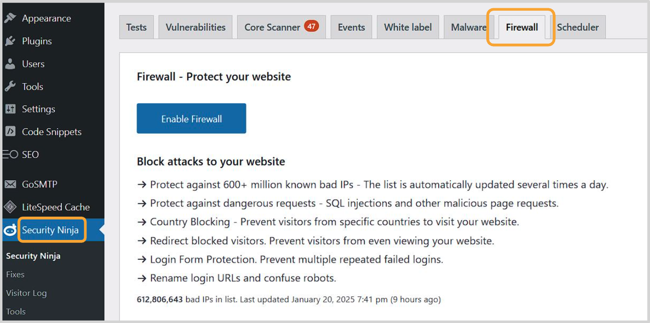 - Once it's installed, go to Security Ninja > Firewall and click Enable Firewall.