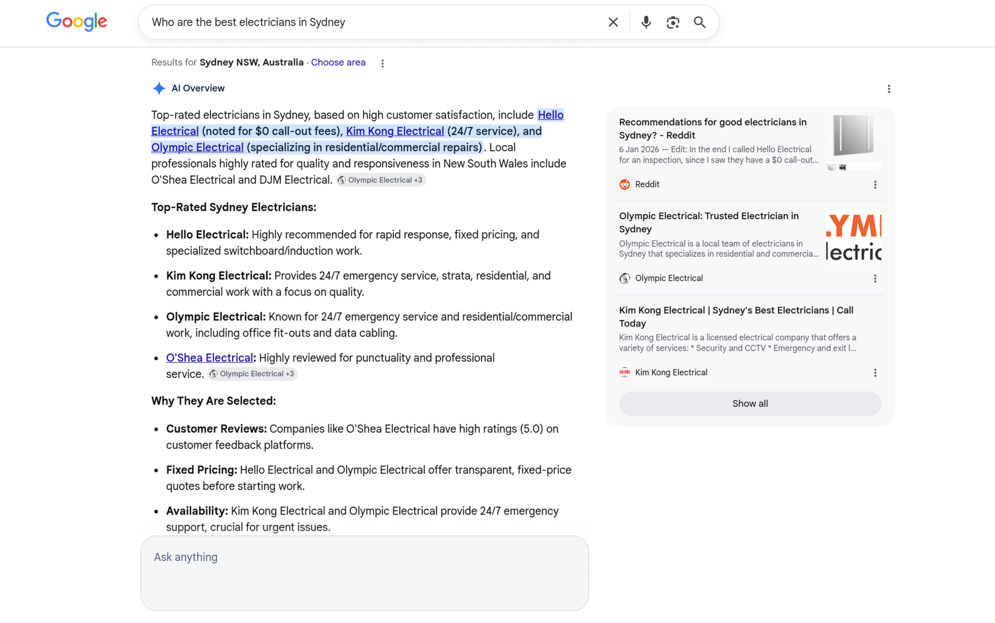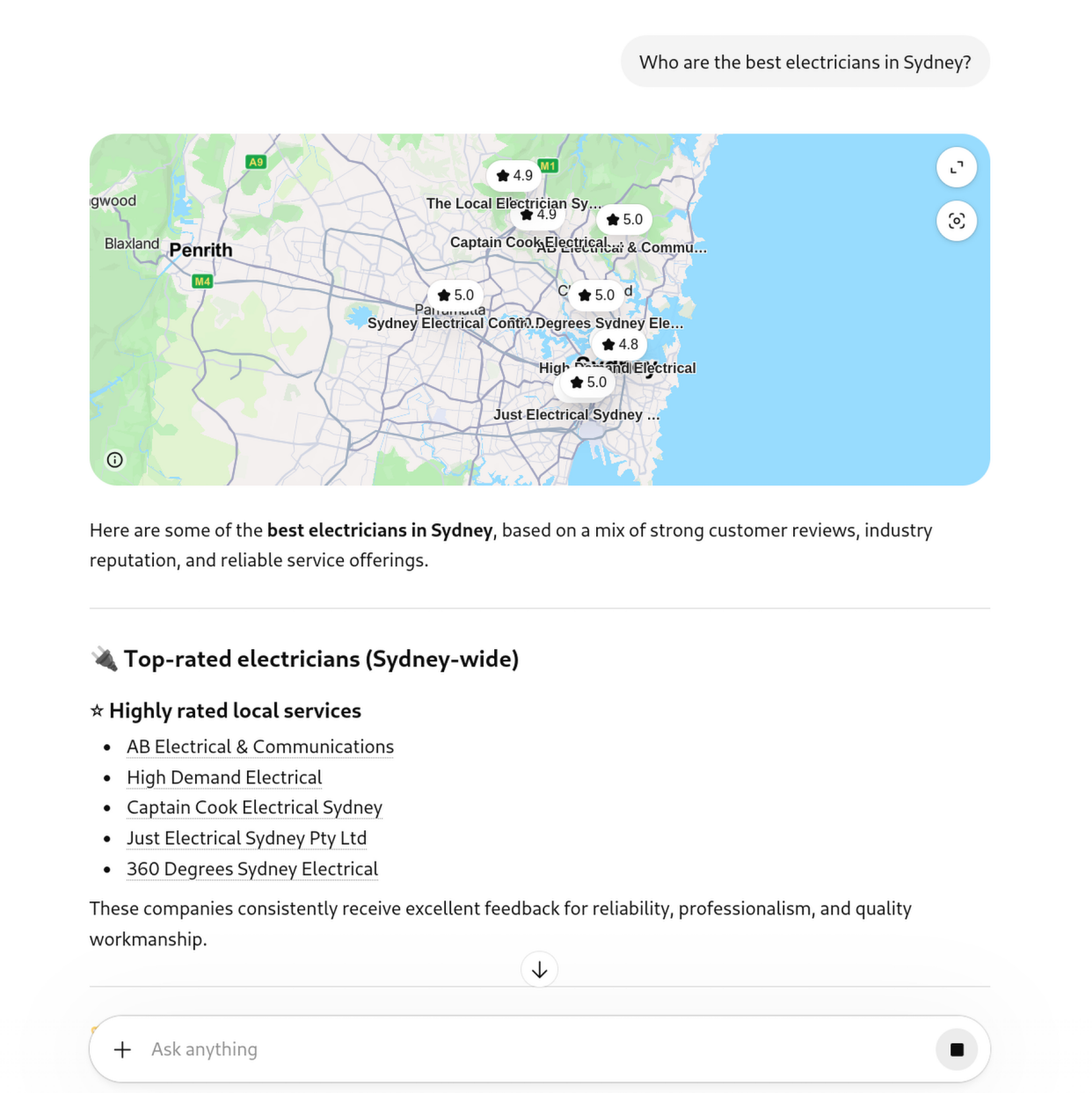 To contrast and compare, we asked ChatGPT: “Who are the best electricians in Sydney?”.