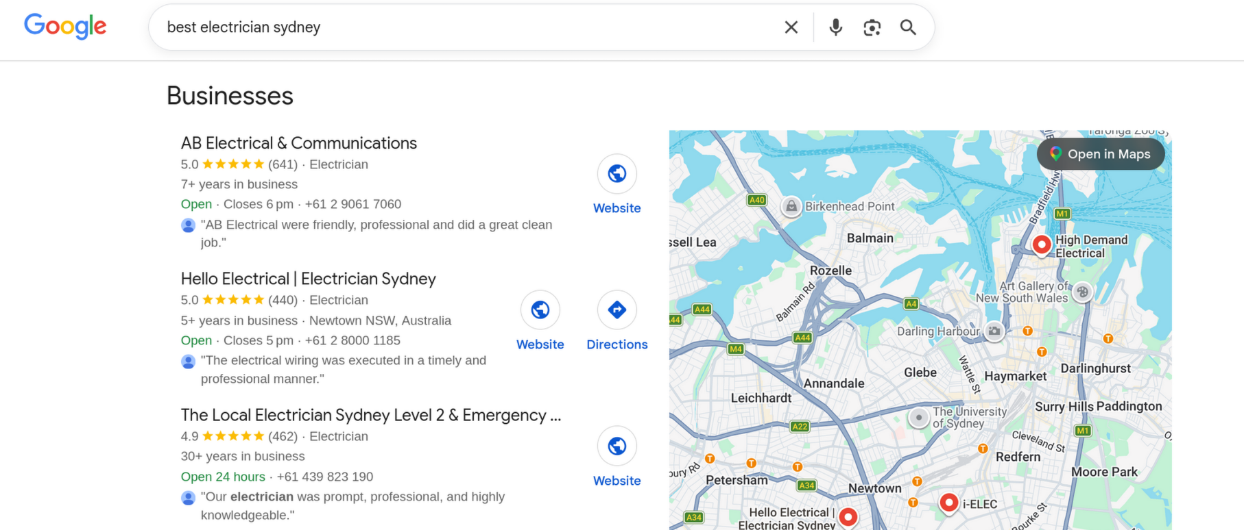 We searched "best electrician Sydney" on Google and got the above results. Ignoring the sponsored result at the top of the list, the electricians ranking highest all had 5.0 or 4.9 average Google ratings), and all operated in nearby locations.