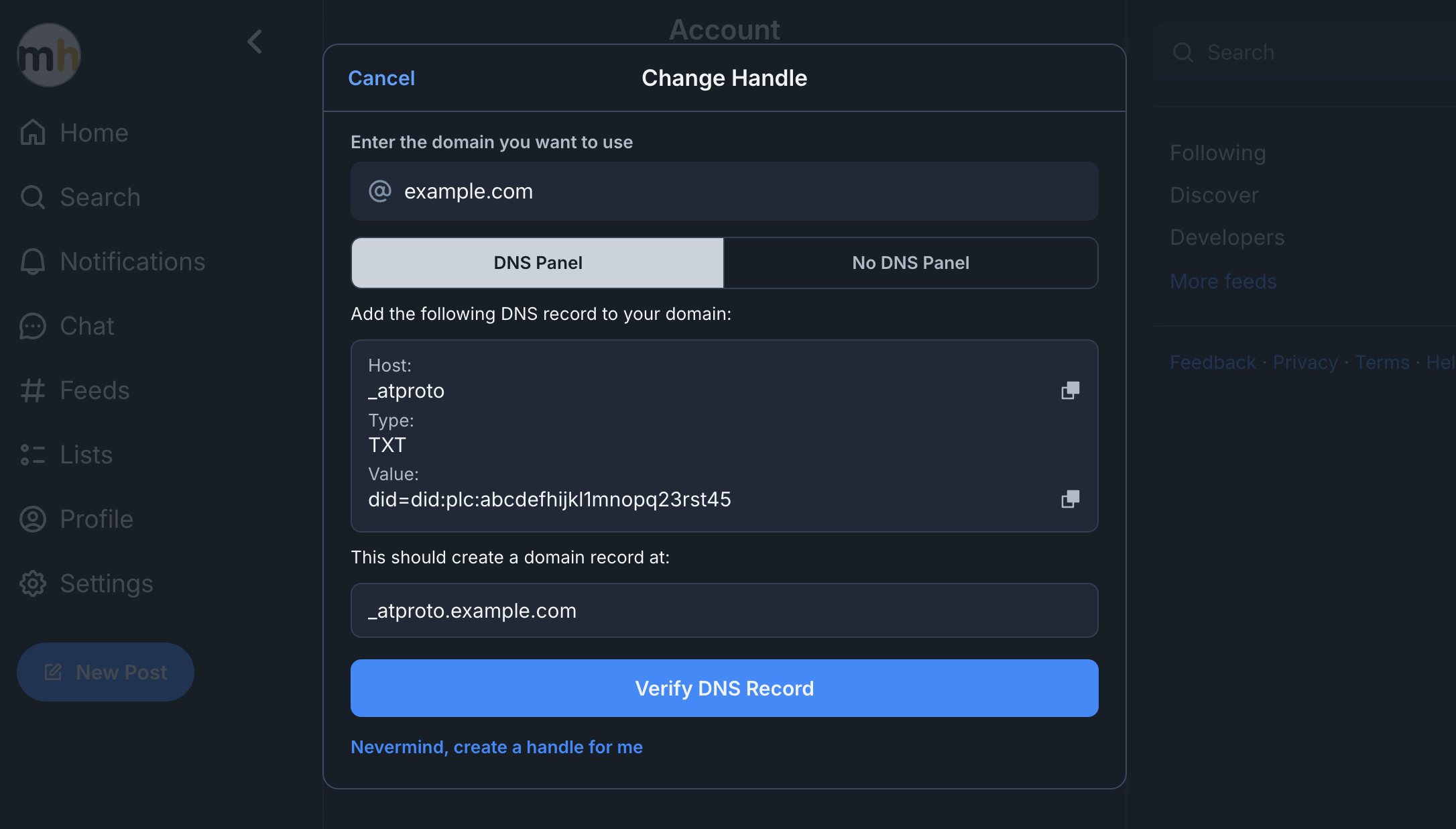- DNS records can take some time to propagate. You can come back to Bluesky and try again later. You'll need to re-enter your domain when you do.