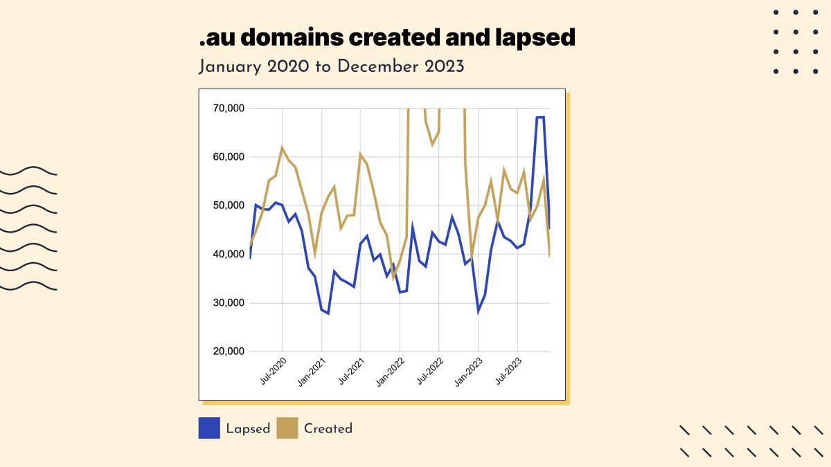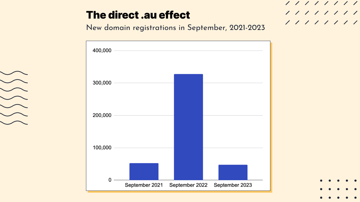 Some of the current decline could be down to the rush to register direct .au domains in 2022. Organisations that switched from something like .com.au or .org.au to a direct .au domain might be letting the old domain lapse (not that changing domains is as easy as it sounds). Or direct .au domains that were grabbed on a whim (or “just in case”) might be expiring after going unused.