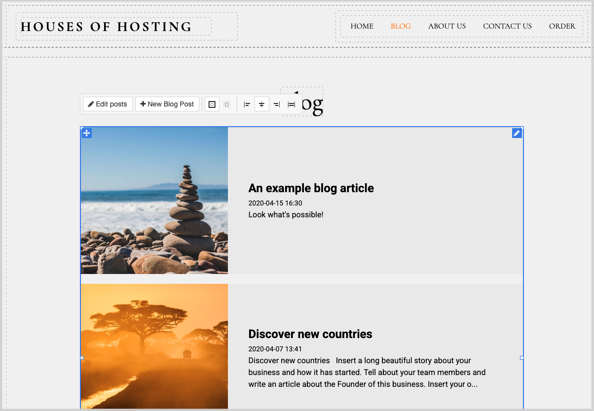 To set a blog, all I had to do was create a page and drag the "Blog" widget into it. Then I could choose a page layout which came with a few example posts to edit.