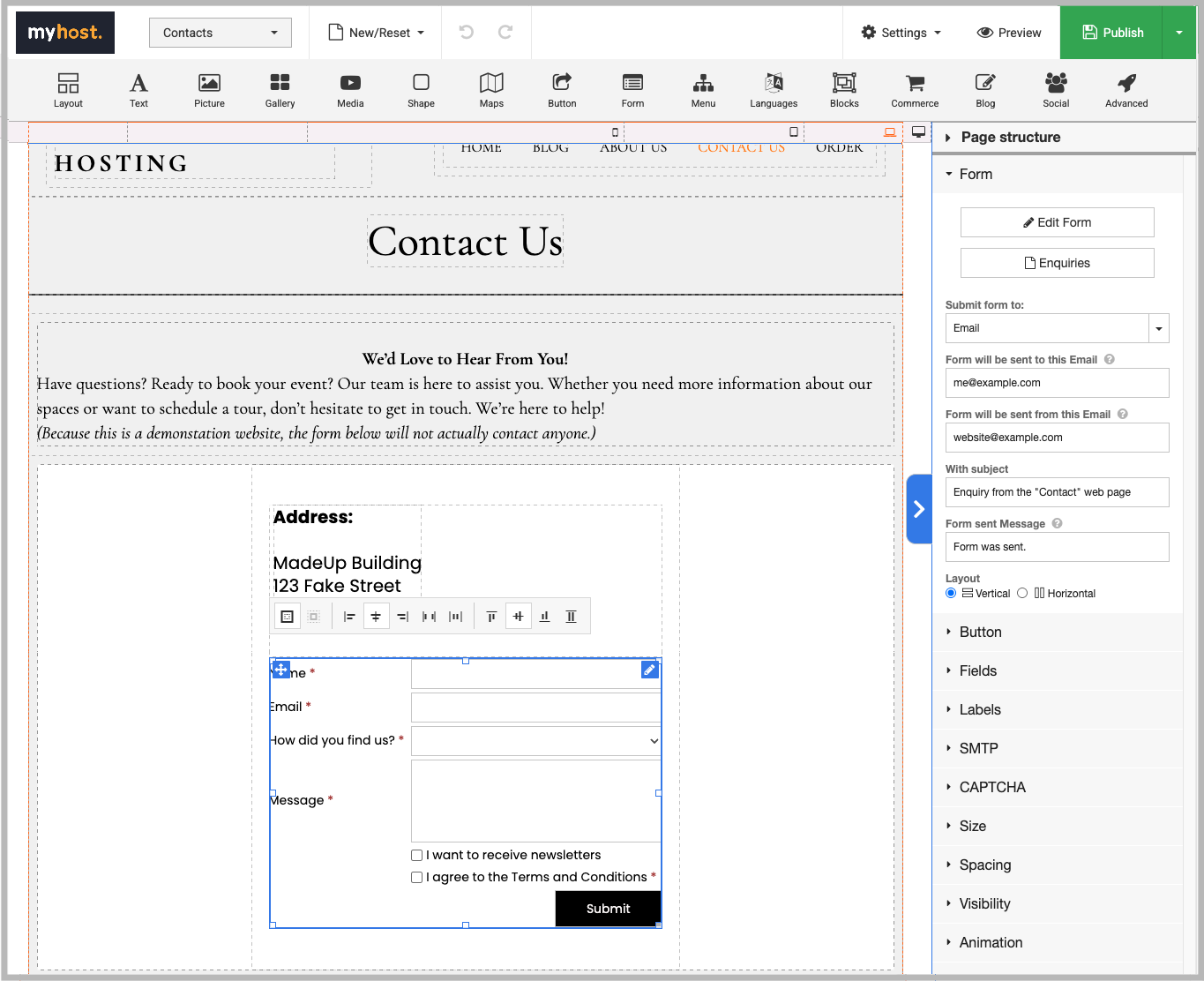 Next, I added a contact form. This is a must-have for any website, as it allows visitors to reach out to you directly. It was a breeze to drag and drop the form element and customise the fields.