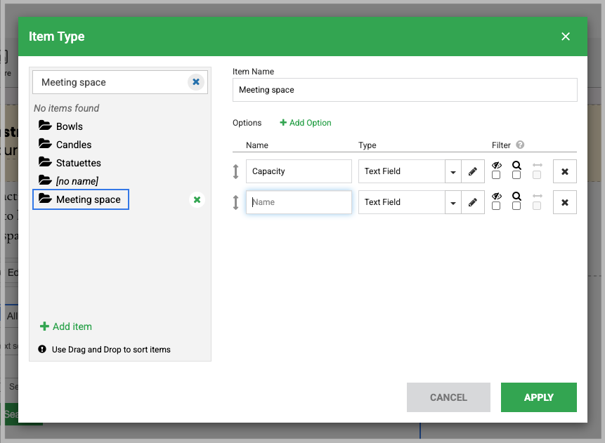 The builder allowed me to upload product images, write descriptions, and organise everything in a neat and user-friendly way. I created a new "Type" of product, "Meeting space", then added "Capacity" as a part of that type. The options here felt endless!