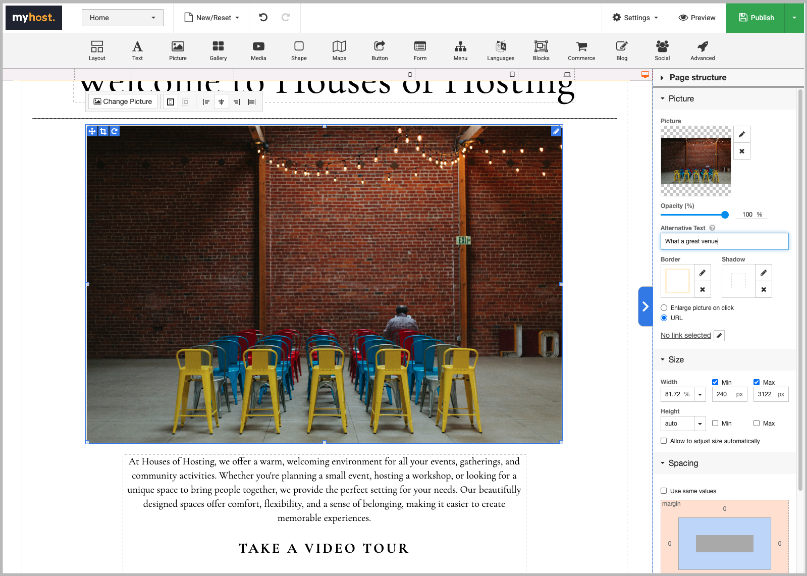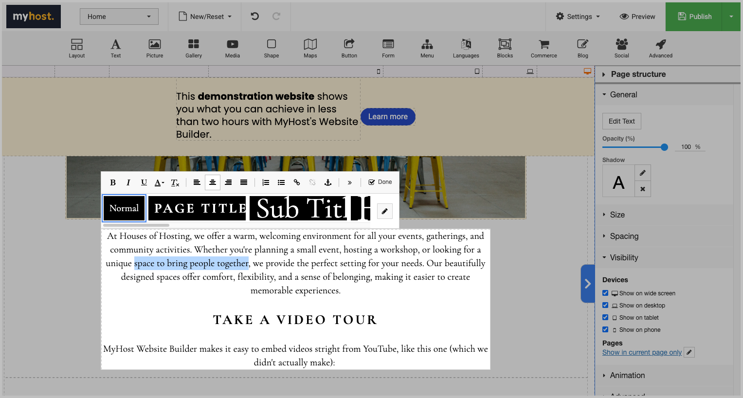 Before I got started in the builder, I'd already invented a fake business (it's called 'Houses of Hosting', but it's not the sort of hosting that we normally talk about here...) and drafted a few paragraphs of site content, found images to use, and chosen a video to embed. So when I say "under two hours", that's the amount of time spent on the actual building of the site.