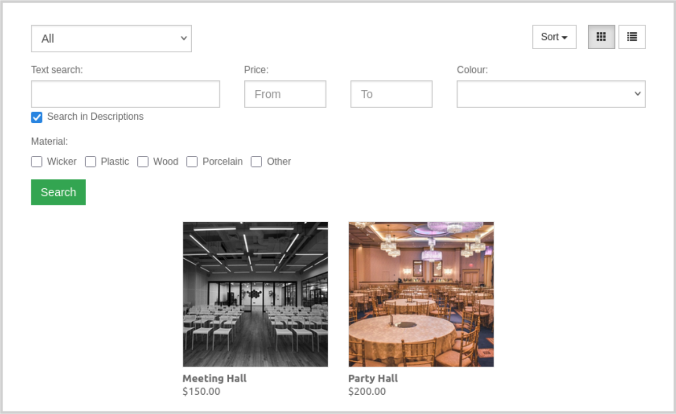 This is definitely somewhere where more time would have been more useful. You can see in the screenshot below that I was listing event venues, but the website still displayed the default options that describe each product as wicker, plastic, wood, etc. All of that is editable. You can see in the live website that I went as far as removing those options and the 'Colour' drop-down lost, but didn't get around to adding new ones (which could have been venue-specific options like indoor or outdoor, seating options, etc).