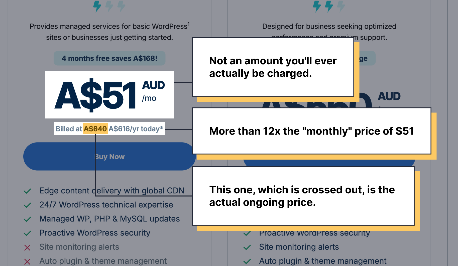 - Nothing in this pricing section mentions a one-off discount, or says what the monthly equivalent of $51 will go up to, or explains why the actual amount billed is more than 12 times the monthly amount. You have to work all of that out for yourself.