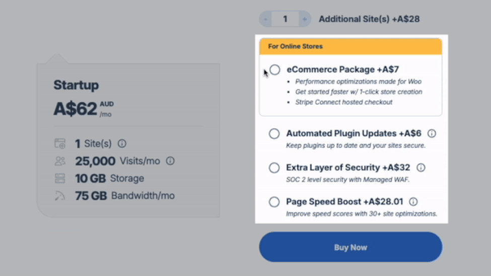 If you’re running a webstore, you’d want the best security that your host can offer. Maybe that's why, when you pick WP Engine’s 'eCommerce Package', the 'Extra Layer of Security' gets more expensive. Or pick the 'Extra Layer of Security' and the 'eCommerce Package' gets more expensive.