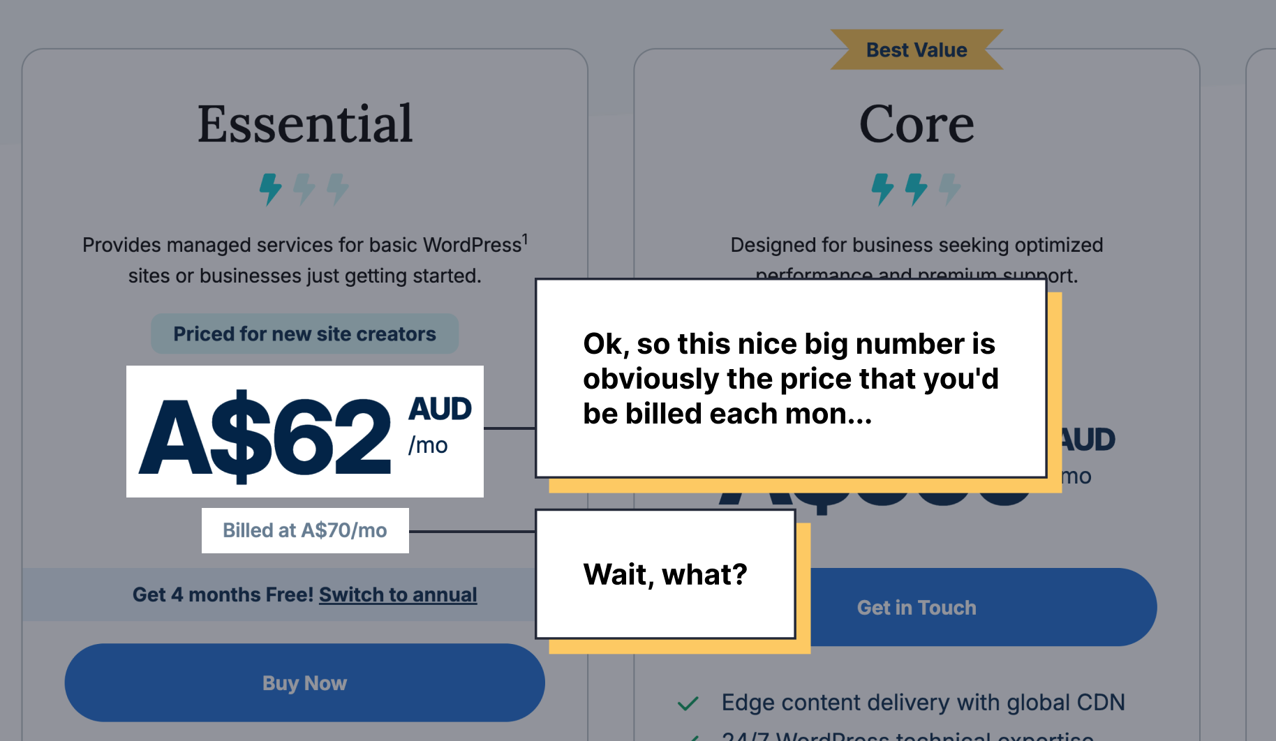 Annual prices that are more than 12 times the monthly price. Add-ons that make each other more expensive. Welcome to WP Engine.